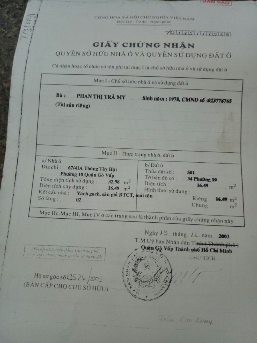 Vị trí : 1/ Phan văn trị, P10, Gò vấp (đói diện Cityland, cách ngã 3 Thống nhất và Phan Văn Trị 300m). Hẽm hơn 2m.